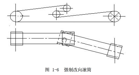 該方案的技術(shù)關(guān)健是在轉(zhuǎn)彎處增設(shè)一個轉(zhuǎn)角滾筒的轉(zhuǎn)彎裝置,使得輸送帶繞過轉(zhuǎn)角滾筒后按設(shè)計角度實現(xiàn)轉(zhuǎn)彎運行。轉(zhuǎn)角滾筒是實現(xiàn)轉(zhuǎn)彎運行的關(guān)健部件,國內(nèi)外轉(zhuǎn)彎輸送機采用的轉(zhuǎn)角滾筒可以分為圓筒式和半筒式兩種;其工作原理是轉(zhuǎn)角滾筒固定不動而在輸送帶繞過滾筒所形成的螺旋軌跡線上,布置安裝若干滾輪,并且使得每個滾輪安裝的軸線都與輸送帶運行方向一致,輸送帶繞過轉(zhuǎn)角滾筒后即可實現(xiàn)轉(zhuǎn)彎運行,如圖1-6所示。