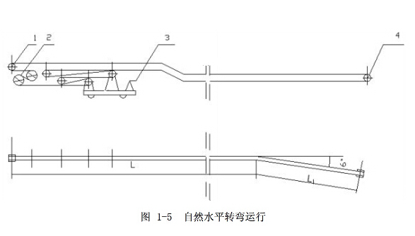 國內(nèi)最早的轉(zhuǎn)彎輸送機就是采用的這種方案,其工作原理是在轉(zhuǎn)彎處按計算的曲率半徑布置輸送機,如圖1-5所示,使得托輥與輸送帶形成安裝支撐角,依靠斜置托輥與輸送帶的橫向推力與彎曲狀態(tài)下的輸送帶張力的向心力平衡,同時還要將彎曲段內(nèi)側(cè)抬高,使輸送帶和物料的重力產(chǎn)生向外側(cè)的分力進一步與向心合力平衡,使輸送帶在托輥上轉(zhuǎn)彎運行。
